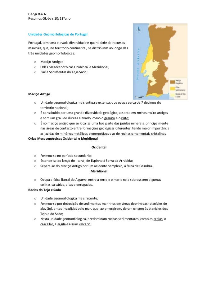 4. 4. Geografia AResumos Globais 10/11ºanoUnidades Geomorfologicas de PortugalPortugal, tem uma elevada diversidade e quantidade de recursosminerais, que, no território continental, se distribuem ao longo dastrês unidades geomorfologicas:o Maciço Antigo;o Orlas Mesocenózoicas Ocidental e Meridional;o Bacia Sedimentar do Tejo-Sado;Maciço Antigoo Unidade geomorfologica mais antiga e extensa, que ocupa cerca de 7 décimos doterritório nacional;o É constituído por uma grande diversidade geológica, assente em rochas muito antigase com um grau de dureza elevado, como o granito e o xisto;o É no maciço antigo que se localiza uma boa parte das jazidas minerais, principalmentenas áreas de contacto entre formações geológicas diferentes, tendo maior importânciaas jazidas de minérios metálicos e energéticos e as de rochas ornamentais cristalinas.Orlas Mesocenózoicas Ocidental e MeridionalOcidentalo Formou-se no período secundário;o Estende-se ao longo do litoral, de Espinho à Serra da Arrábida;o Separa-se do Maciço Antigo por um acidente complexo, a falha de Coimbra.Meridionalo Ocupa a faixa litoral do Algarve, entre a serra e o mar e nela sobressaem algumascolinas calcárias, altas e enrugadas.Bacias do Tejo e Sadoo Unidade geomorfologica mais recente;o Formou-se por deposição de sedimentos marinhos em áreas deprimidas (planícies dealuvião), antes invadidas pelo mar, que, ao emergirem, deram origem às planícies dosTejo e do Sado;o Nesta unidade geomorfologica, predominam rochas sedimentares, como as areias, ocascalho, a argila e algum calcário.