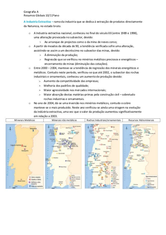5. 5. Geografia AResumos Globais 10/11ºanoA Industria Extractiva – ramo da industria que se dedica á extracção de produtos directamenteda Natureza, no estado bruto.o A Industria extractiva nacional, conheceu no final do século XX (entre 1989 e 1998),uma alteração provocada no subsector, devido:Ao arranque de projectos como o da mina de neves corvo;o A partir de meados da década de 90, a tendência verificada sofre uma alteração,assistindo-se assim a um decréscimo no subsector das minas, devido:Á diminuição da produção;Regressão que se verificou no minérios metálicos preciosos e energéticos –encerramento de minas (diminuição das cotações).o Entre 2000 – 2004, manteve-se a tendência de regressão dos minerais energéticos emetálicos. Contudo neste período, verificou-se que até 2002, o subsector das rochasindustriais e ornamentais, conheceu um aumento de produção devido:Aumento da competitividade das empresas;Melhoria dos padrões de qualidade;Maior agressividade nos mercados internacionais;Maior absorção destas matérias-primas pela construção civil – sobretudorochas industrias e ornamentais.o No ano de 2004, dá-se uma inversão nos minérios metálicos, contudo o cobremanteve-se o mais produzido. Neste ano verificou-se ainda uma viragem na evoluçãoda indústria extractiva, uma vez que o valor da produção aumentou significativamenteem relação a 2003.Minerais Metálicos Minerais não metálicos Rochas Industriais/ornamentais Recursos Hidrominerais