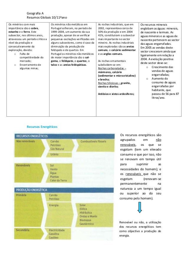 6. 6. Geografia AResumos Globais 10/11ºanoOs minérios com maisimportância são o cobre,estanho e o ferro. Estesubsector, nos últimos anos,atravessou um período crítico anível da produção econsecutivamente daexploração, devido:o Falta decompetitividade domercado;o Encerramento dealgumas minas;Os minérios não metálicos emPortugal sofreram, no período de1999-2004, um aumento da suaprodução, apesar de se verificarpequenas oscilações verificadas emalguns subsectores, como é caso dadiminuição da produção defeldspato e de quartzo. EmPortugal os minérios não metálicosde maior importância são o sal-gema, o feldspato, o quartzo, otalco e as areias feldspáticas.As rochas industriais, que em2002, representava cerca de50% da produção e em 200441%, constituíram o subsectormais importante no sectormineiro. As rochas industriaismais exploradas são as areiascomuns, o calcário sedimentare as argilas comuns.As rochas ornamentaissubdividem-se em:Rochas carbonatadas –mármores, calcário(sedimentar e microcristalino)e brecha;Rochas Siliciosas – granito,sienito e diorito;Ardósias e xistos ardosiferos;Os recursos mineraisenglobam as águas: minerais,de nascente e termais. Asaguas minerais e as aguas denascente pertencem ao sectordas aguas engarrafadas.Em 2005 as vendas destesector cresceram ainda queligeiramente em relação a2004. A evolução positivadeste sector deve-se:o Crescimento dasvendas de aguasengarrafadas;o Aumento doconsumo de aguasengarrafadas porhabitante, quepassou de 56 para 87litros/ano.Recursos EnergéticosOs recursos energéticos sãoagrupados em nãorenováveis, os que seesgotam (tem um elevadoconsumo e que por isso, nãose renovam em tempo útilpara suprimir asnecessidades do homem); eos renováveis que não seesgotam (renovam-sepermanentemente nanatureza a um tempo igualou superior ao do seuconsumo pelo homem).Renovável ou não, a utilizaçãodos recursos energéticos temcomo objectivo a produção deenergia.