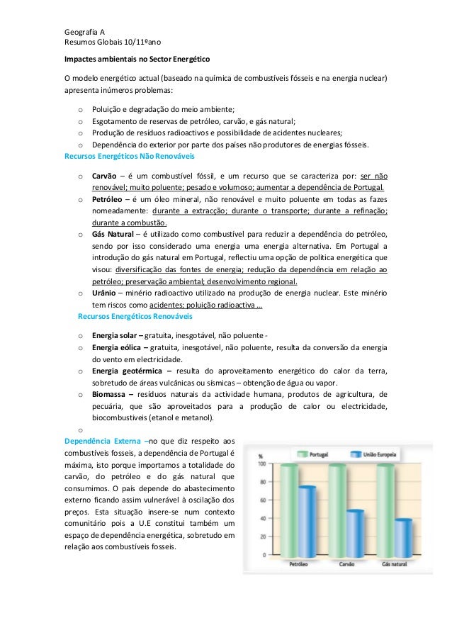 7. 7. Geografia AResumos Globais 10/11ºanoImpactes ambientais no Sector EnergéticoO modelo energético actual (baseado na química de combustíveis fósseis e na energia nuclear)apresenta inúmeros problemas:o Poluição e degradação do meio ambiente;o Esgotamento de reservas de petróleo, carvão, e gás natural;o Produção de resíduos radioactivos e possibilidade de acidentes nucleares;o Dependência do exterior por parte dos países não produtores de energias fósseis.Recursos Energéticos Não Renováveiso Carvão – é um combustível fóssil, e um recurso que se caracteriza por: ser nãorenovável; muito poluente; pesado e volumoso; aumentar a dependência de Portugal.o Petróleo – é um óleo mineral, não renovável e muito poluente em todas as fazesnomeadamente: durante a extracção; durante o transporte; durante a refinação;durante a combustão.o Gás Natural – é utilizado como combustível para reduzir a dependência do petróleo,sendo por isso considerado uma energia uma energia alternativa. Em Portugal aintrodução do gás natural em Portugal, reflectiu uma opção de politica energética quevisou: diversificação das fontes de energia; redução da dependência em relação aopetróleo; preservação ambiental; desenvolvimento regional.o Urânio – minério radioactivo utilizado na produção de energia nuclear. Este minériotem riscos como acidentes; poluição radioactiva …Recursos Energéticos Renováveiso Energia solar – gratuita, inesgotável, não poluente -o Energia eólica – gratuita, inesgotável, não poluente, resulta da conversão da energiado vento em electricidade.o Energia geotérmica – resulta do aproveitamento energético do calor da terra,sobretudo de áreas vulcânicas ou sísmicas – obtenção de água ou vapor.o Biomassa – resíduos naturais da actividade humana, produtos de agricultura, depecuária, que são aproveitados para a produção de calor ou electricidade,biocombustiveis (etanol e metanol).oDependência Externa –no que diz respeito aoscombustíveis fosseis, a dependência de Portugal émáxima, isto porque importamos a totalidade docarvão, do petróleo e do gás natural queconsumimos. O país depende do abastecimentoexterno ficando assim vulnerável à oscilação dospreços. Esta situação insere-se num contextocomunitário pois a U.E constitui também umespaço de dependência energética, sobretudo emrelação aos combustíveis fosseis.