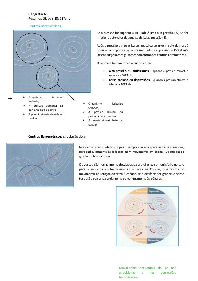 9. 9. Geografia AResumos Globais 10/11ºanoCentros BarométricosCentros Barométricos: circulação do arSe a pressão for superior a 1013mb, é uma alta pressão (A); Se forinferior a este valor designa-se de baixa pressão (B).Após a pressão atmosférica ser reduzida ao nível médio do mar, épossível unir pontos c/ o mesmo valor de pressão – ISOBÁRAS.Destas surgem configurações são chamados centros barométricos.Os centros barométricos resultantes, são:> Alta pressão ou anticiclones – quando a pressão atmosf. ésuperior a 1013mb.> Baixa pressão ou depressões – quando a pressão atmosf. éinferior a 1013mb Organismo isobáricofechado; A pressão aumenta daperiferia para o centro; A pressão é mais elevada nocentro Organismo isobáricofechado; A pressão diminui daperiferia para o centro; A pressão é mais baixa nocentro.Nos centros barométricos, sopram sempre das altas para as baixas pressões,perpendicularmente às isóbaras, num movimento em espiral. Dá origem aogradiente barométrico.Os ventos são normalmente desviados para a direita, no hemisfério norte epara a esquerda no hemisfério sul – Força de Coriolis, que resulta domovimento de rotação da terra. Contudo, se a distância for grande, o ventotenderá a soprar paralelamente ou obliquamente às isóbaras.Movimentos horizontais do ar nosanticiclones e nas depressõesbarométricas.