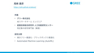 4. 4. Copyright © GREE, Inc. All Rights Reserved. • • ! ( ) ! • • AutoML 1 (Feurer and Hutter, 2019) • ! ! f(x) f(x) f(x) x ” ”
