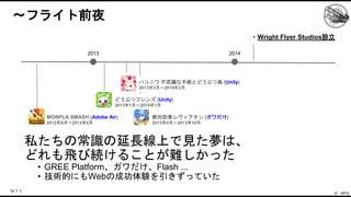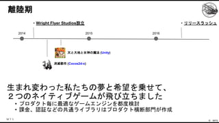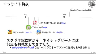 10. 10. 〜フライト前夜 私たちの常識の延長線上で見た夢は、 どれも飛び続けることが難しかった • GREE Platform、ガワだけ、Flash ... • 技術的にもWebの成功体験を引きずっていた 2013 2014 ・Wright Flyer Studios設立 MONPLA SMASH (Adobe Air) 2012年8月〜2013年8月 どうぶつフレンズ (Unity) 2013年1月〜2014年1月 絶対防衛レヴィアタン (ガワだけ) 2013年4月〜2013年10月 ハコニワ 不思議な手紙とどうぶつ島 (Unity) 2013年3月〜2016年2月 ©️ WFS
