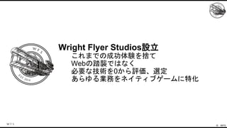 11. 11. Wright Flyer Studios設立 これまでの成功体験を捨て Webの踏襲ではなく 必要な技術を0から評価、選定 あらゆる業務をネイティブゲームに特化 ©️ WFS