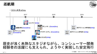 18. 18. 巡航期 歴史が浅く未熟なスタジオながら、コンシューマー開発 経験者の活躍にも支えられ、ようやく実現した安定飛行 ・リリースラッシュ 2017 2018 2019 2DアクションRPG (Cocos2d-x) 追憶の青 (Cocos2d-x) ららマジ (Unity) 武器よさらば (Unity) アナザーエデン (Cocos2d-x) ダンメモ (Cocos2d-x) 3DアクションRPG#1 (Unity) 3DアクションRPG#2(Unity) 2Dアク ション RPG 3Dアク ション RPG#1 3Dアク ション RPG#2 ©️ 大森藤ノ・SBクリエイティブ/ダンまち2製作委員会 ©️ WFS