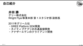 2. 2. 自己紹介 井田 勝 グリー株式会社 Wright Flyer事業本部 第1スタジオ部 副部長 2011年グリー入社 ・GREE Platform SDK開発 ・ネイティブアプリの共通基盤開発 ・アナザーエデンのクライアント開発 ©️ WFS