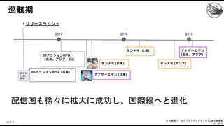20. 20. 巡航期 配信国も徐々に拡大に成功し、国際線へと進化 ・リリースラッシュ 2017 2018 2019 2DアクションRPG(日本) アナザーエデン (日本) ダンメモ (日本) アナザーエデン (北米、アジア)2DアクションRPG (北米、アジア、EU) ダンメモ (北米) ダンメモ (アジア) 2Dアク ション RPG ©️ 大森藤ノ・SBクリエイティブ/ダンまち2製作委員会 ©️ WFS