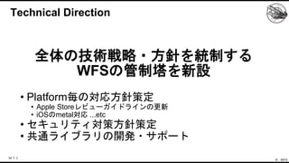 22. 22. Technical Direction • Platform毎の対応方針策定 • Apple Storeレビューガイドラインの更新 • iOSのmetal対応 ...etc • セキュリティ対策方針策定 • 共通ライブラリの開発・サポート 全体の技術戦略・方針を統制する WFSの管制塔を新設 ©️ WFS