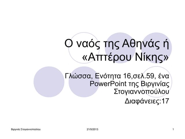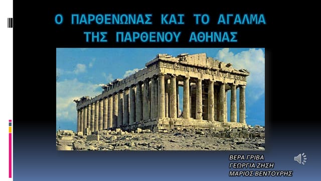 Άγαλμα Αθηνάς Παρθένου (αναπαράσταση) Κράνος με μυθολογικά ζώα Η γέννηση της Πανδώρας Χρυσελεφάντινη Νίκη ύψους 2 μ. Οικουρός όφις (φίδι-φύλακας της Ακρόπολης)