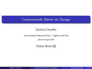 1. 1. Customizando Admin do Django Gustavo Carvalho Universidade Federal do Piau´ı / Agˆencia 128 Bits about.me/gt.salles Python Brasil [9] Gustavo Carvalho Customizando Admin do Django Python Brasil [9] 1 / 35