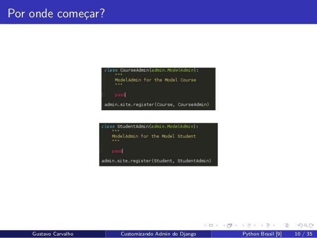 10. 10. Por onde come¸car? Gustavo Carvalho Customizando Admin do Django Python Brasil [9] 10 / 35
