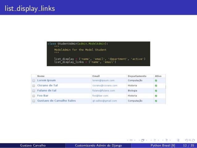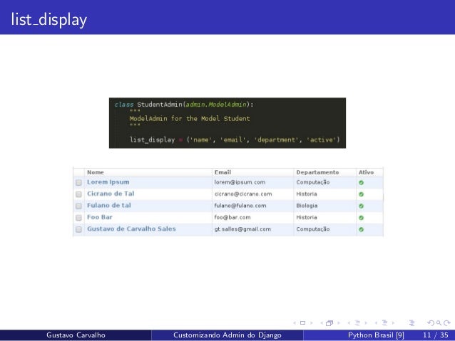 11. 11. list display Gustavo Carvalho Customizando Admin do Django Python Brasil [9] 11 / 35