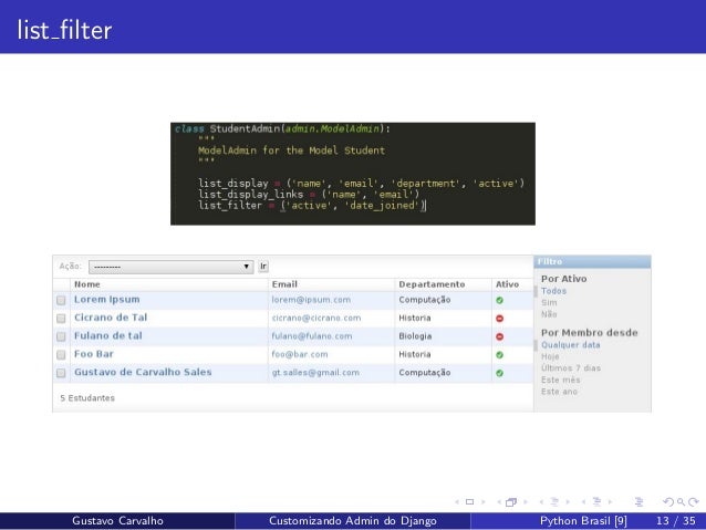 13. 13. list filter Gustavo Carvalho Customizando Admin do Django Python Brasil [9] 13 / 35