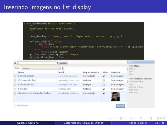 16. 16. Inserindo imagens no list display Gustavo Carvalho Customizando Admin do Django Python Brasil [9] 16 / 35
