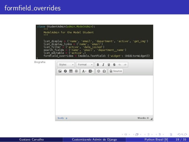 19. 19. formfield overrides Gustavo Carvalho Customizando Admin do Django Python Brasil [9] 19 / 35