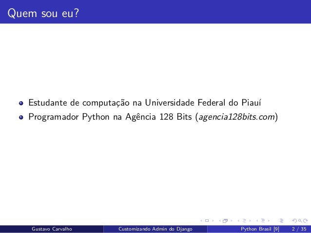2. 2. Quem sou eu? Estudante de computa¸c˜ao na Universidade Federal do Piau´ı Programador Python na Agˆencia 128 Bits (agencia128bits.com) Gustavo Carvalho Customizando Admin do Django Python Brasil [9] 2 / 35