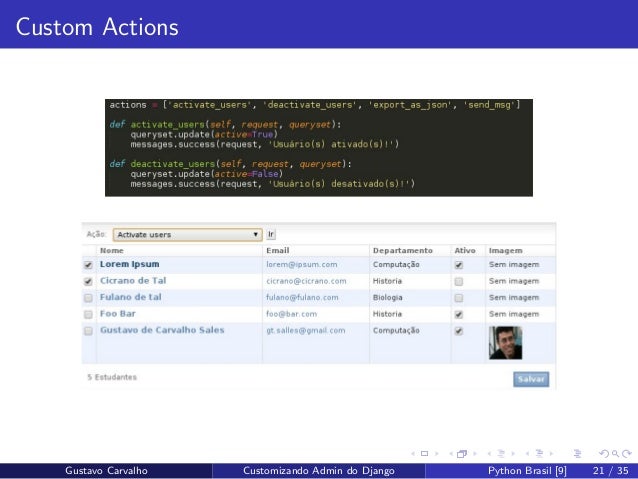21. 21. Custom Actions Gustavo Carvalho Customizando Admin do Django Python Brasil [9] 21 / 35