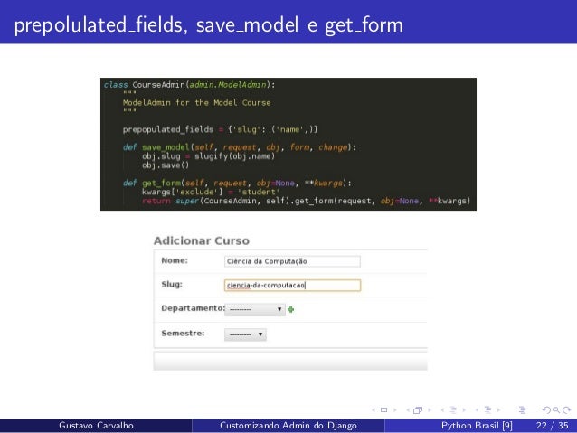 22. 22. prepolulated fields, save model e get form Gustavo Carvalho Customizando Admin do Django Python Brasil [9] 22 / 35