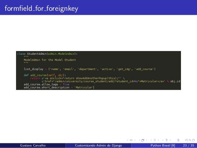 23. 23. formfield for foreignkey Gustavo Carvalho Customizando Admin do Django Python Brasil [9] 23 / 35