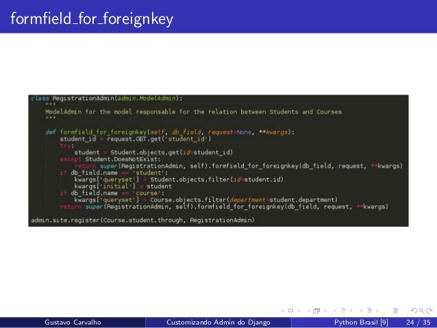 24. 24. formfield for foreignkey Gustavo Carvalho Customizando Admin do Django Python Brasil [9] 24 / 35
