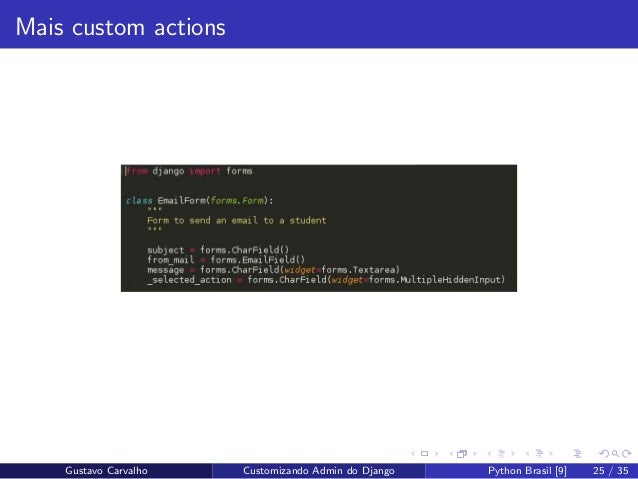 25. 25. Mais custom actions Gustavo Carvalho Customizando Admin do Django Python Brasil [9] 25 / 35