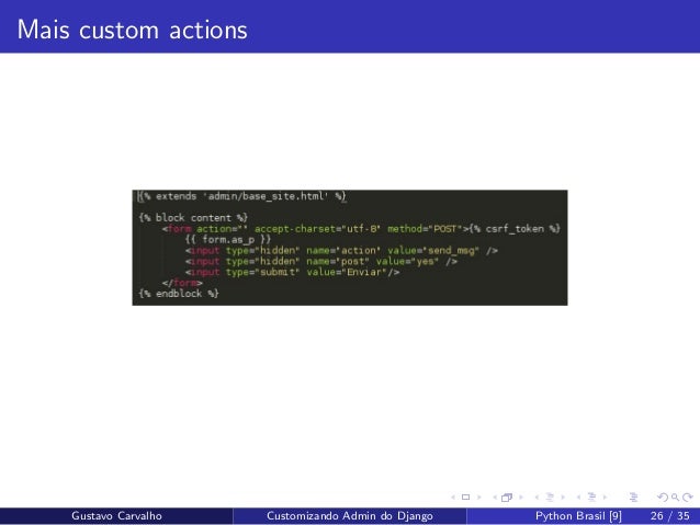 26. 26. Mais custom actions Gustavo Carvalho Customizando Admin do Django Python Brasil [9] 26 / 35