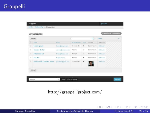 29. 29. Grappelli http://grappelliproject.com/ Gustavo Carvalho Customizando Admin do Django Python Brasil [9] 29 / 35