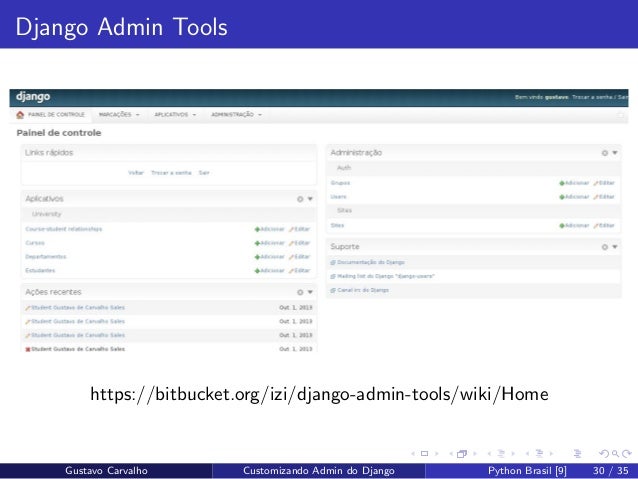 30. 30. Django Admin Tools https://bitbucket.org/izi/django-admin-tools/wiki/Home Gustavo Carvalho Customizando Admin do Django Python Brasil [9] 30 / 35