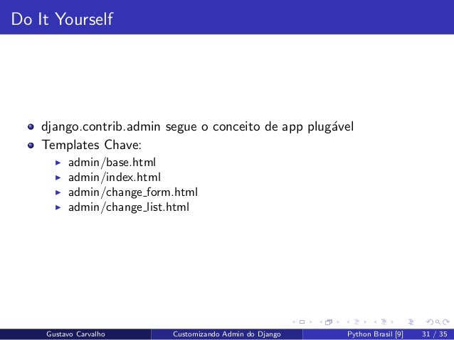 31. 31. Do It Yourself django.contrib.admin segue o conceito de app plug´avel Templates Chave: admin/base.html admin/index.html admin/change form.html admin/change list.html Gustavo Carvalho Customizando Admin do Django Python Brasil [9] 31 / 35