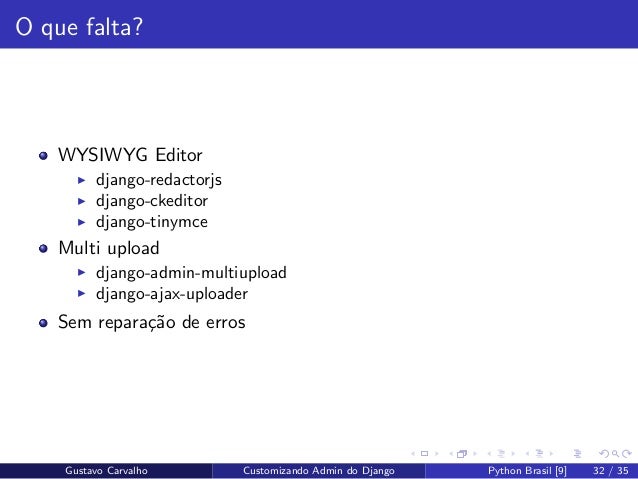 32. 32. O que falta? WYSIWYG Editor django-redactorjs django-ckeditor django-tinymce Multi upload django-admin-multiupload django-ajax-uploader Sem repara¸c˜ao de erros Gustavo Carvalho Customizando Admin do Django Python Brasil [9] 32 / 35