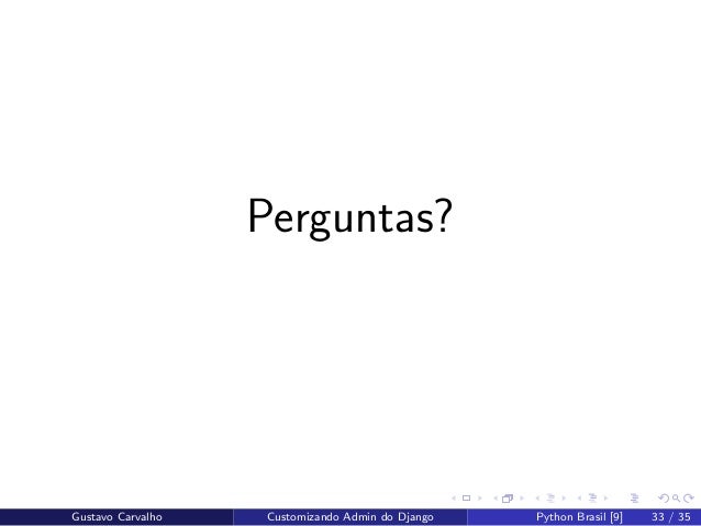 33. 33. Perguntas? Gustavo Carvalho Customizando Admin do Django Python Brasil [9] 33 / 35