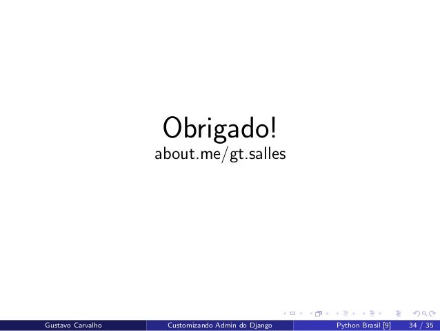 34. 34. Obrigado! about.me/gt.salles Gustavo Carvalho Customizando Admin do Django Python Brasil [9] 34 / 35