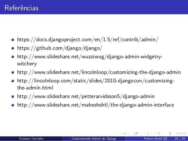 35. 35. Referˆencias https://docs.djangoproject.com/en/1.5/ref/contrib/admin/ https://github.com/django/django/ http://www.slideshare.net/wuzziwug/django-admin-widgetry- witchery http://www.slideshare.net/lincolnloop/customizing-the-django-admin http://lincolnloop.com/static/slides/2010-djangocon/customizing- the-admin.html http://www.slideshare.net/petterarvidsson5/django-admin http://www.slideshare.net/maheshshtl/the-django-admin-interface Gustavo Carvalho Customizando Admin do Django Python Brasil [9] 35 / 35