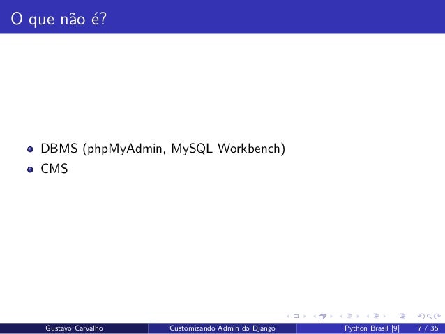 7. 7. O que n˜ao ´e? DBMS (phpMyAdmin, MySQL Workbench) CMS Gustavo Carvalho Customizando Admin do Django Python Brasil [9] 7 / 35
