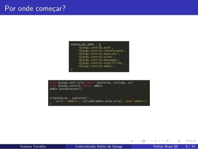 8. 8. Por onde come¸car? Gustavo Carvalho Customizando Admin do Django Python Brasil [9] 8 / 35