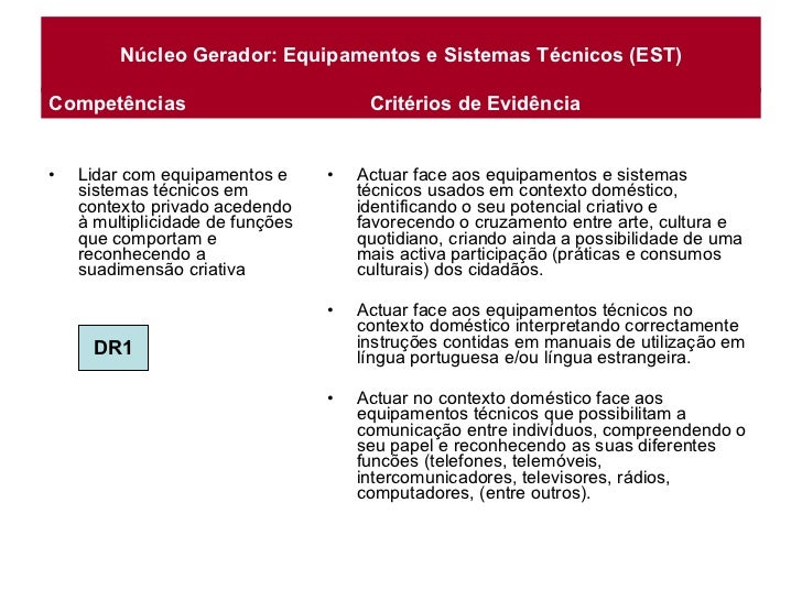 4. 4. Núcleo Gerador: Equipamentos e Sistemas Técnicos (EST) <ul><li>Lidar com equipamentos e sistemas técnicos em contexto privado acedendo à multiplicidade de funções que comportam e reconhecendo a suadimensão criativa </li></ul><ul><li>Actuar face aos equipamentos e sistemas técnicos usados em contexto doméstico, identificando o seu potencial criativo e favorecendo o cruzamento entre arte, cultura e quotidiano, criando ainda a possibilidade de uma mais activa participação (práticas e consumos culturais) dos cidadãos. </li></ul><ul><li>Actuar face aos equipamentos técnicos no contexto doméstico interpretando correctamente instruções contidas em manuais de utilização em língua portuguesa e/ou língua estrangeira. </li></ul><ul><li>Actuar no contexto doméstico face aos equipamentos técnicos que possibilitam a comunicação entre indivíduos, compreendendo o seu papel e reconhecendo as suas diferentes funcões (telefones, telemóveis, intercomunicadores, televisores, rádios, computadores, (entre outros). </li></ul>Competências Critérios de Evidência DR1