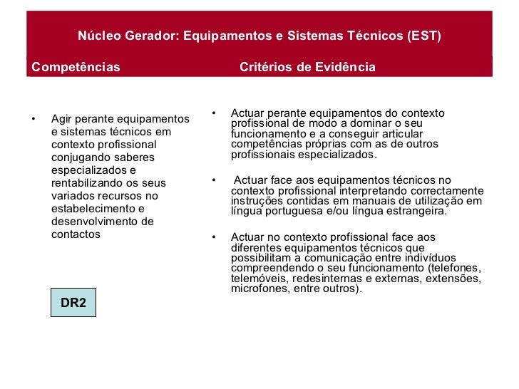 5. 5. Núcleo Gerador: Equipamentos e Sistemas Técnicos (EST) <ul><li>Agir perante equipamentos e sistemas técnicos em contexto profissional conjugando saberes especializados e rentabilizando os seus variados recursos no estabelecimento e desenvolvimento de contactos </li></ul><ul><li>Actuar perante equipamentos do contexto profissional de modo a dominar o seu funcionamento e a conseguir articular competências próprias com as de outros profissionais especializados. </li></ul><ul><li>Actuar face aos equipamentos técnicos no contexto profissional interpretando correctamente instruções contidas em manuais de utilização em língua portuguesa e/ou língua estrangeira. </li></ul><ul><li>Actuar no contexto profissional face aos diferentes equipamentos técnicos que possibilitam a comunicação entre indivíduos compreendendo o seu funcionamento (telefones, telemóveis, redesinternas e externas, extensões, microfones, entre outros). </li></ul>Competências Critérios de Evidência DR2 Competências Critérios de Evidência