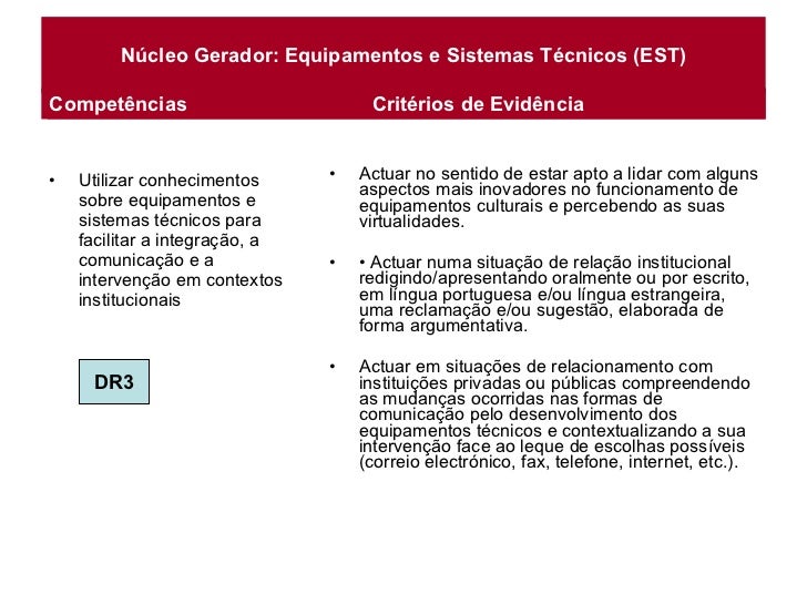 6. 6. Núcleo Gerador: Equipamentos e Sistemas Técnicos (EST) <ul><li>Utilizar conhecimentos sobre equipamentos e sistemas técnicos para facilitar a integração, a comunicação e a intervenção em contextos institucionais </li></ul><ul><li>Actuar no sentido de estar apto a lidar com alguns aspectos mais inovadores no funcionamento de equipamentos culturais e percebendo as suas virtualidades. </li></ul><ul><li>• Actuar numa situação de relação institucional redigindo/apresentando oralmente ou por escrito, em língua portuguesa e/ou língua estrangeira, uma reclamação e/ou sugestão, elaborada de forma argumentativa. </li></ul><ul><li>Actuar em situações de relacionamento com instituições privadas ou públicas compreendendo as mudanças ocorridas nas formas de comunicação pelo desenvolvimento dos equipamentos técnicos e contextualizando a sua intervenção face ao leque de escolhas possíveis (correio electrónico, fax, telefone, internet, etc.). </li></ul>Competências Critérios de Evidência DR3 Competências Critérios de Evidência