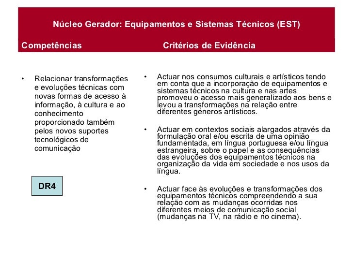 7. 7. Núcleo Gerador: Equipamentos e Sistemas Técnicos (EST) <ul><li>Relacionar transformações e evoluções técnicas com novas formas de acesso à informação, à cultura e ao conhecimento proporcionado também pelos novos suportes tecnológicos de comunicação </li></ul><ul><li>Actuar nos consumos culturais e artísticos tendo em conta que a incorporação de equipamentos e sistemas técnicos na cultura e nas artes promoveu o acesso mais generalizado aos bens e levou a transformações na relação entre diferentes géneros artísticos. </li></ul><ul><li>Actuar em contextos sociais alargados através da formulação oral e/ou escrita de uma opinião fundamentada, em língua portuguesa e/ou língua estrangeira, sobre o papel e as consequências das evoluções dos equipamentos técnicos na organização da vida em sociedade e nos usos da língua. </li></ul><ul><li>Actuar face às evoluções e transformações dos equipamentos técnicos compreendendo a sua relação com as mudanças ocorridas nos diferentes meios de comunicação social (mudanças na TV, na rádio e no cinema). </li></ul>Competências Critérios de Evidência DR4 Competências Critérios de Evidência