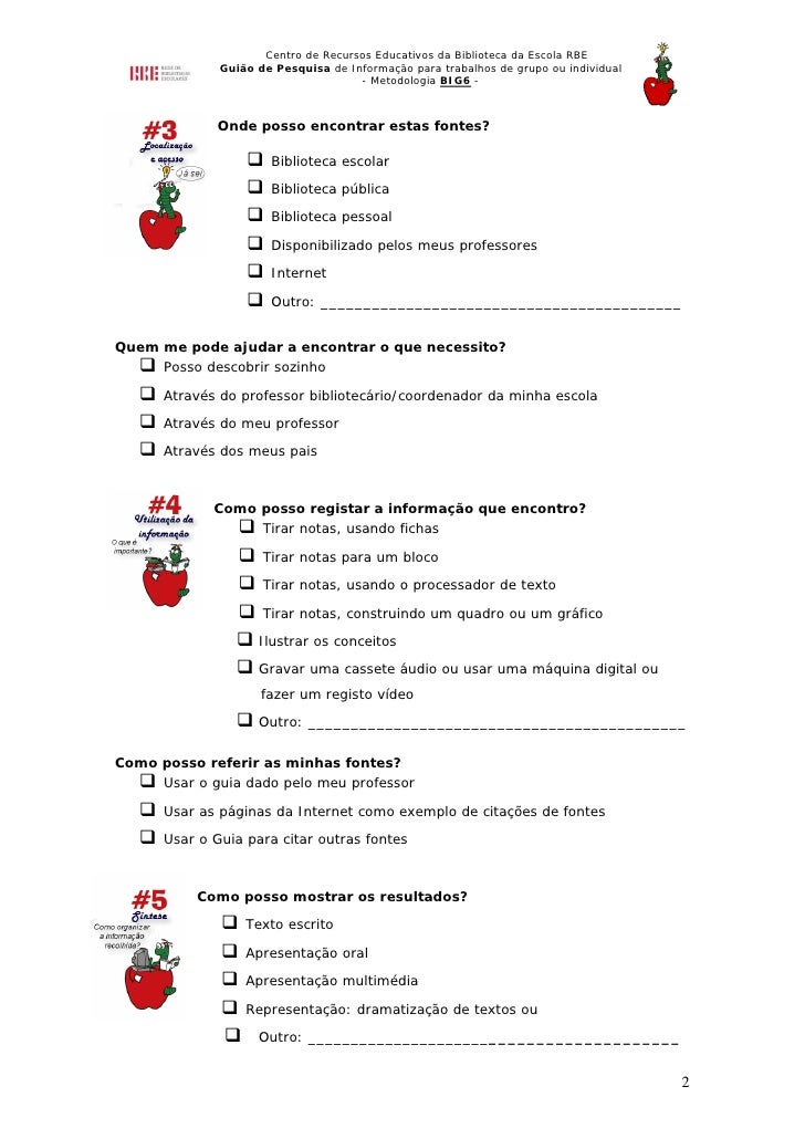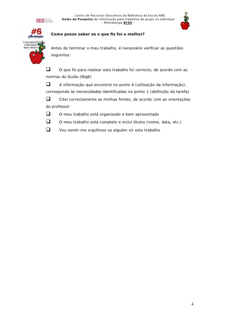4. 4. Centro de Recursos Educativos da Biblioteca da Escola RBE Guião de Pesquisa de Informação para trabalhos de grupo ou individual - Metodologia BIG6 - Como posso saber se o que fiz foi o melhor? Antes de terminar o meu trabalho, é necessário verificar as questões seguintes: O que fiz para realizar este trabalho foi correcto, de acordo com as normas do Guião (Big6) A informação que encontrei no ponto 4 (utilização da informação), corresponde às necessidades identificadas no ponto 1 (definição da tarefa) Citei correctamente as minhas fontes, de acordo com as orientações do professor O meu trabalho está organizado e bem apresentado O meu trabalho está completo e inclui títulos (nome, data, etc.) Vou sentir-me orgulhoso se alguém vir este trabalho 4