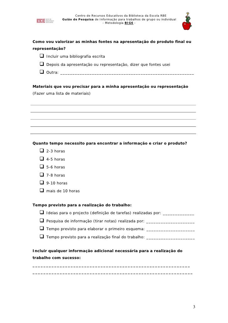 2. 2. Centro de Recursos Educativos da Biblioteca da Escola RBE Guião de Pesquisa de Informação para trabalhos de grupo ou individual - Metodologia BIG6 - Onde posso encontrar estas fontes? Biblioteca escolar Biblioteca pública Biblioteca pessoal Disponibilizado pelos meus professores Internet Outro: __________________________________________ Quem me pode ajudar a encontrar o que necessito? Posso descobrir sozinho Através do professor bibliotecário/coordenador da minha escola Através do meu professor Através dos meus pais Como posso registar a informação que encontro? Tirar notas, usando fichas Tirar notas para um bloco Tirar notas, usando o processador de texto Tirar notas, construindo um quadro ou um gráfico Ilustrar os conceitos Gravar uma cassete áudio ou usar uma máquina digital ou fazer um registo vídeo Outro: ____________________________________________ Como posso referir as minhas fontes? Usar o guia dado pelo meu professor Usar as páginas da Internet como exemplo de citações de fontes Usar o Guia para citar outras fontes Como posso mostrar os resultados? Texto escrito Apresentação oral Apresentação multimédia Representação: dramatização de textos ou Outro: _________________________________________ 2