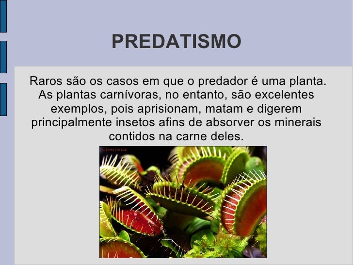 10. 10. PREDATISMO Raros são os casos em que o predador é uma planta. As plantas carnívoras, no entanto, são excelentes exemplos, pois aprisionam, matam e digerem principalmente insetos afins de absorver os minerais contidos na carne deles.