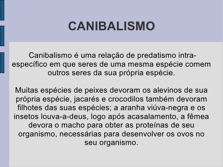 11. 11. CANIBALISMO Canibalismo é uma relação de predatismo intra- específico em que seres de uma mesma espécie comem outros seres da sua própria espécie. Muitas espécies de peixes devoram os alevinos de sua própria espécie, jacarés e crocodilos também devoram filhotes das suas espécies; a aranha viúva-negra e os insetos louva-a-deus, logo após acasalamento, a fêmea devora o macho para obter as proteínas de seu organismo, necessárias para desenvolver os ovos no seu organismo.