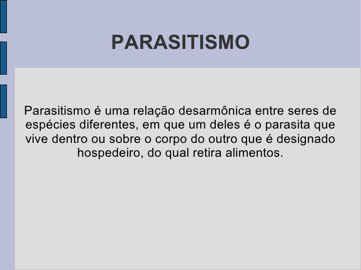 13. 13. PARASITISMO Parasitismo é uma relação desarmônica entre seres de espécies diferentes, em que um deles é o parasita que vive dentro ou sobre o corpo do outro que é designado hospedeiro, do qual retira alimentos.