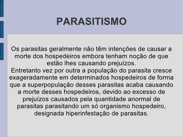 14. 14. PARASITISMO Os parasitas geralmente não têm intenções de causar a morte dos hospedeiros embora tenham noção de que estão lhes causando prejuízos. Entretanto vez por outra a população do parasita cresce exageradamente em determinados hospedeiros de forma que a superpopulação desses parasitas acaba causando a morte desses hospedeiros, devido ao excesso de prejuízos causados pela quantidade anormal de parasitas parasitando um só organismo hospedeiro, designada hiperinfestação de parasitas.