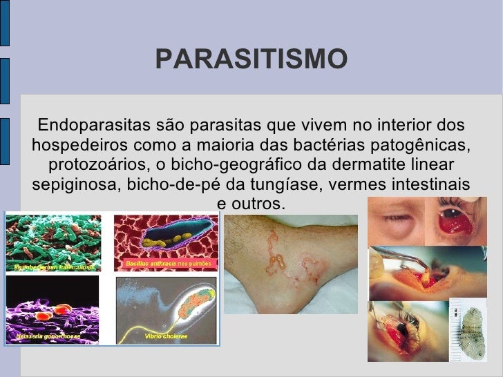 15. 15. PARASITISMO Endoparasitas são parasitas que vivem no interior dos hospedeiros como a maioria das bactérias patogênicas, protozoários, o bicho-geográfico da dermatite linear sepiginosa, bicho-de-pé da tungíase, vermes intestinais e outros.