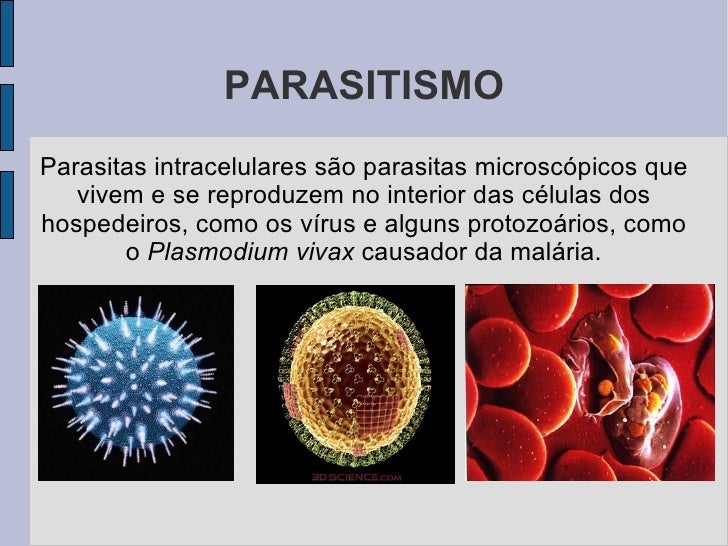 16. 16. PARASITISMO Parasitas intracelulares são parasitas microscópicos que vivem e se reproduzem no interior das células dos hospedeiros, como os vírus e alguns protozoários, como o Plasmodium vivax causador da malária.