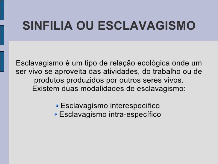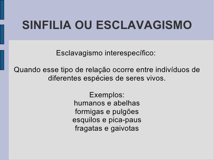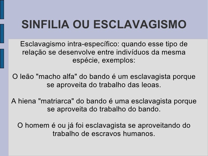 27. 27. SINFILIA OU ESCLAVAGISMO Esclavagismo intra-específico: quando esse tipo de relação se desenvolve entre indivíduos da mesma espécie, exemplos: O leão "macho alfa" do bando é um esclavagista porque se aproveita do trabalho das leoas. A hiena "matriarca" do bando é uma esclavagista porque se aproveita do trabalho do bando. O homem é ou já foi esclavagista se aproveitando do trabalho de escravos humanos.