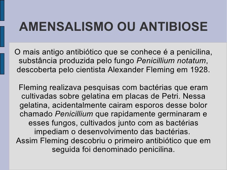 2. 2. AMENSALISMO OU ANTIBIOSE O mais antigo antibiótico que se conhece é a penicilina, substância produzida pelo fungo Penicillium notatum, descoberta pelo cientista Alexander Fleming em 1928. Fleming realizava pesquisas com bactérias que eram cultivadas sobre gelatina em placas de Petri. Nessa gelatina, acidentalmente cairam esporos desse bolor chamado Penicillium que rapidamente germinaram e esses fungos, cultivados junto com as bactérias impediam o desenvolvimento das bactérias. Assim Fleming descobriu o primeiro antibiótico que em seguida foi denominado penicilina.