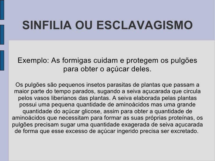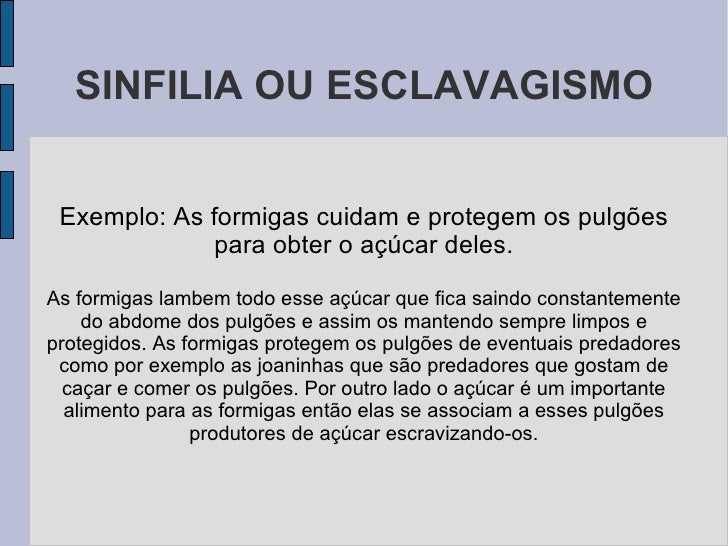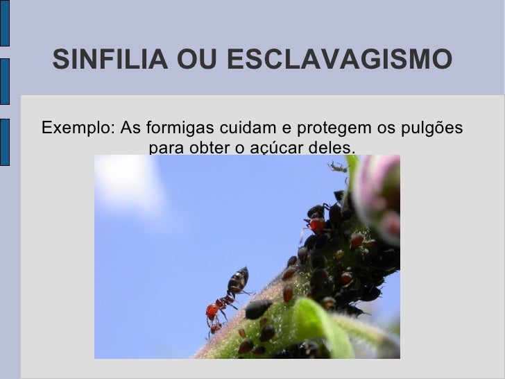 21. 21. SINFILIA OU ESCLAVAGISMO Exemplo: As formigas cuidam e protegem os pulgões para obter o açúcar deles. As formigas lambem todo esse açúcar que fica saindo constantemente do abdome dos pulgões e assim os mantendo sempre limpos e protegidos. As formigas protegem os pulgões de eventuais predadores como por exemplo as joaninhas que são predadores que gostam de caçar e comer os pulgões. Por outro lado o açúcar é um importante alimento para as formigas então elas se associam a esses pulgões produtores de açúcar escravizando-os.